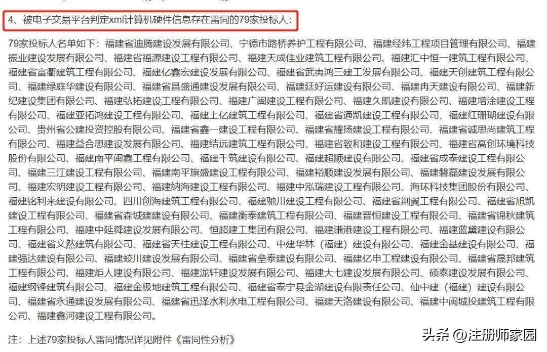近日,福建招投标市场某污水管网改造项目开标,有79家投标人,被 电子交易平台判定xml计算机硬件信息存在雷同 ,并公布在了官网上,详情如下。