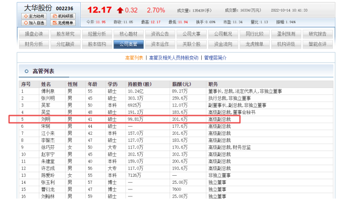 大华股份高级副总裁刘明年薪高达2016万 现又获授股票待遇真好