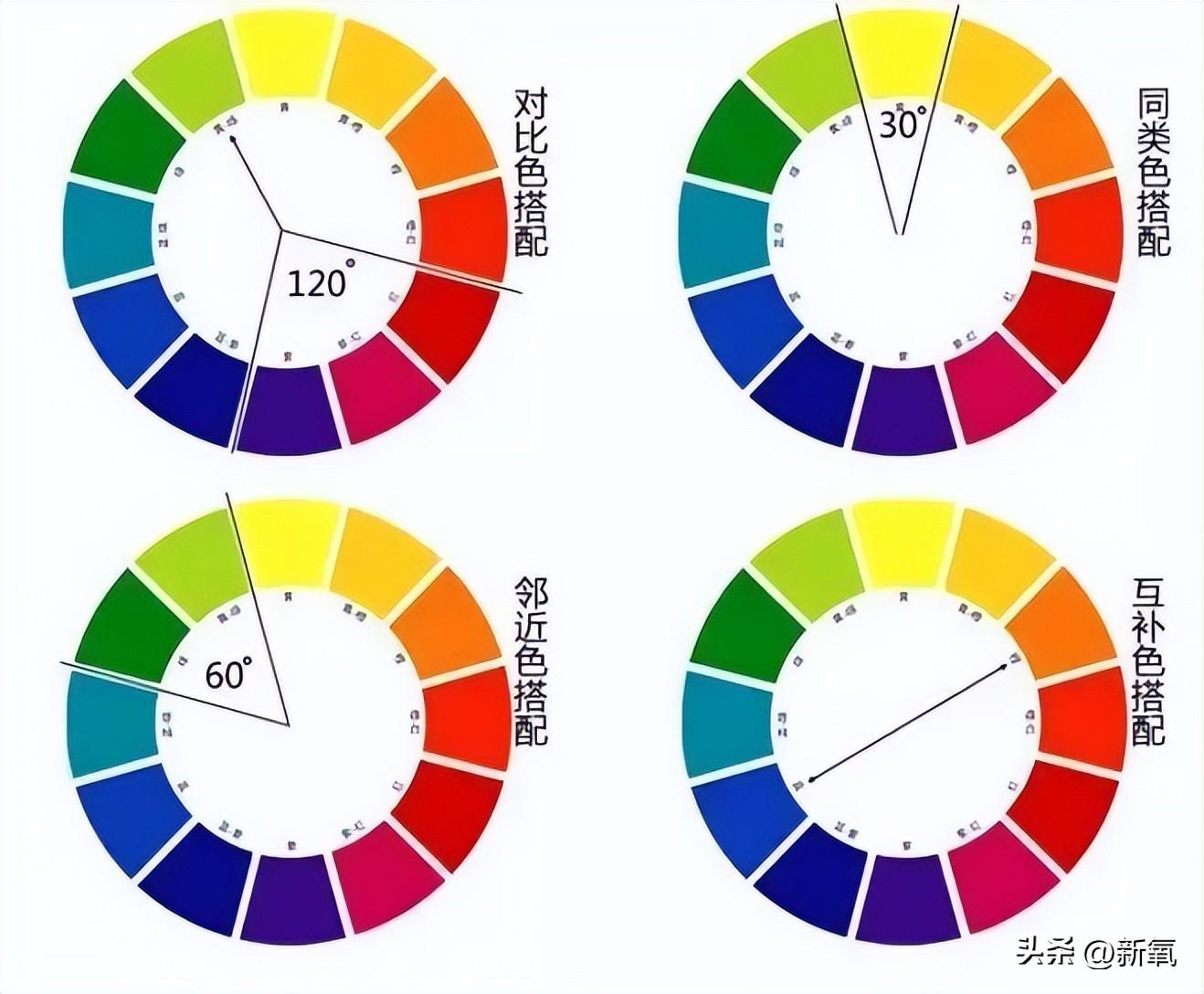 其次,色彩搭配上遵循色盘上的互补、邻近、同类、对比几种关系。