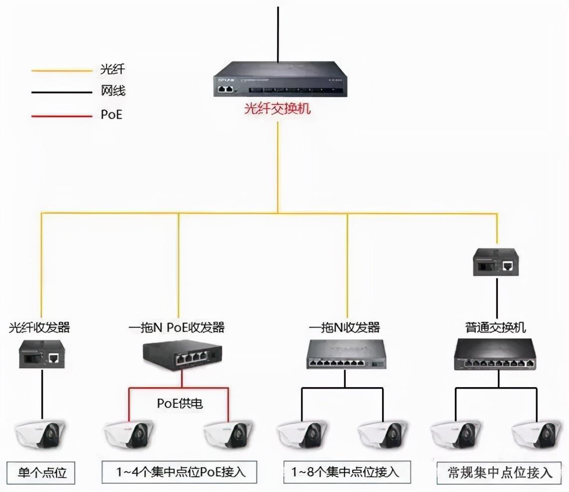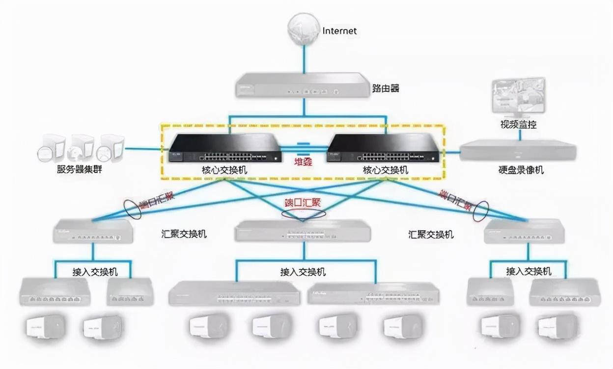 大中型的监控网络,通常会按照接入-汇聚-核心三层结构设计。