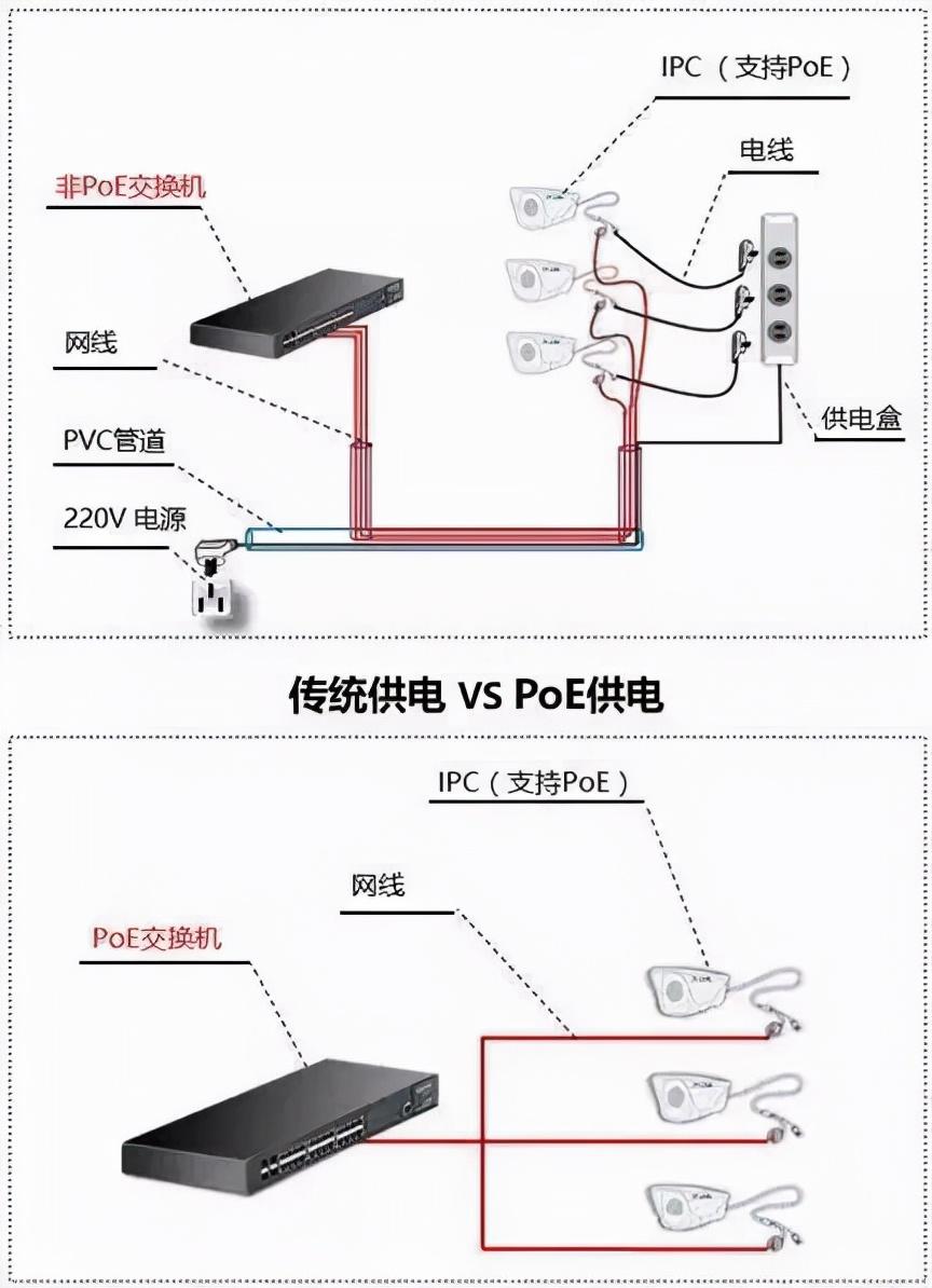 PoE是通过网线进行供电和数据传输的一种技术,只需要一条网线就可以接入一个PoE摄像机点位,不需要额外的电源布线。