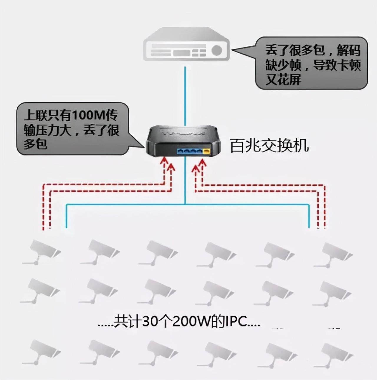 比如百兆的交换机转发超出100M的数据量,就会造成大量丢包,导致花屏卡顿现象。