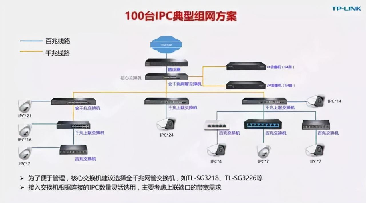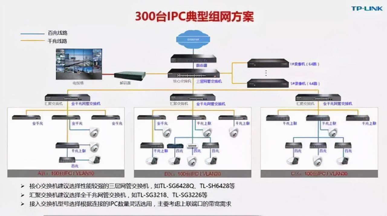 对于大型或超大型(300~1000)的监控网络,需要使用三层交换机划分网段,建议使用三层交换机。下面给大家100、300、500个点位的组网方案。