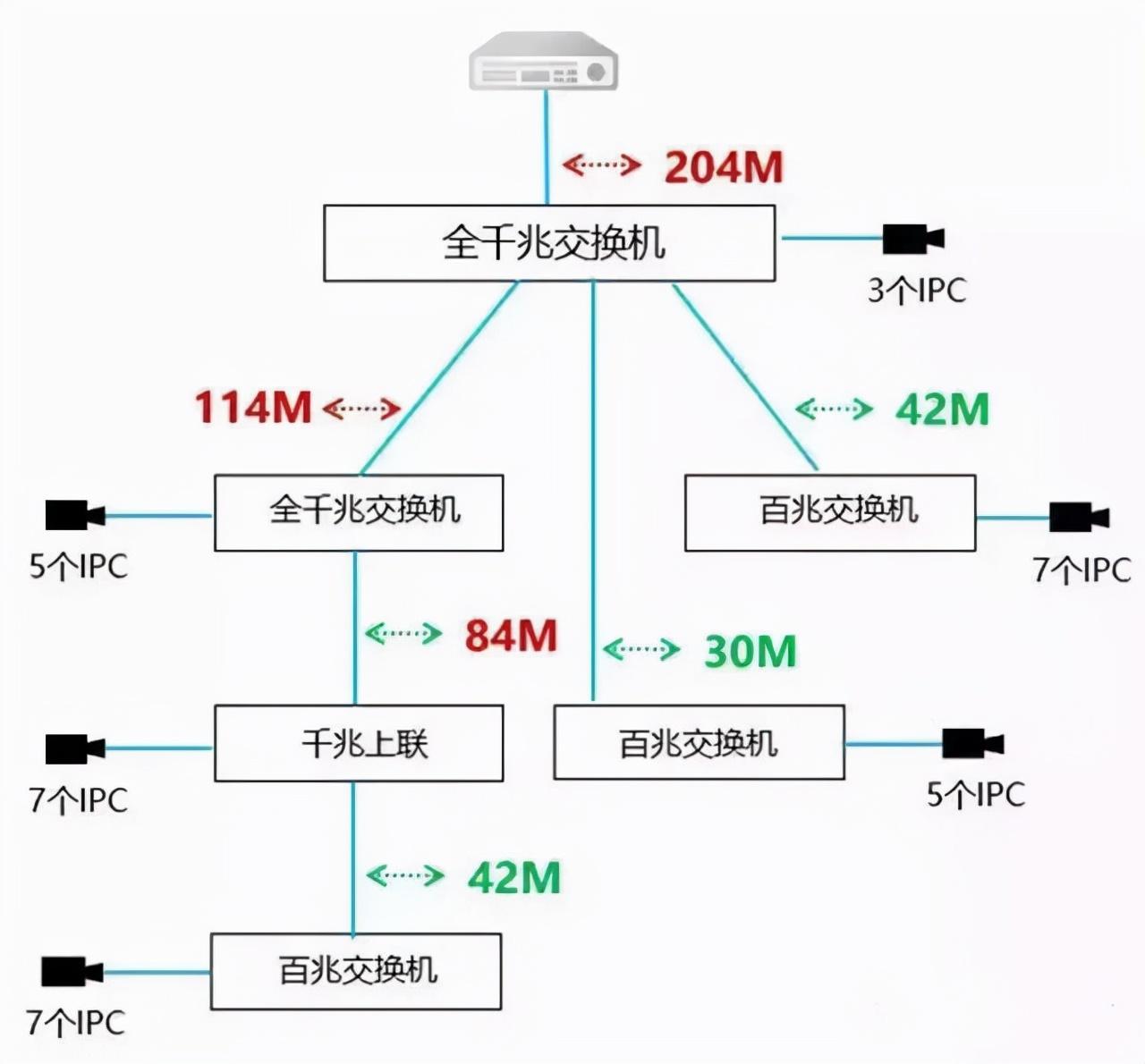 我们以H.264 200W摄像机(主子码流按4+1M计算),常见的串联型网络中的带宽计算和交换机选型: