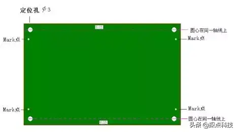 1、关于定位孔: PCB板的四角要留四个孔(最小孔径 2.5mm),用于印刷锡膏时定位电路板。要求X轴或Y轴方向圆心在同一轴线上,如下图: