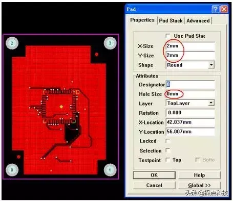 13、关于BGA: 由于BGA封装比较特殊,其焊盘都在芯片底下,外面看不到焊接效果。为了返修方便,建议在PCB板上打两个 Hole Size:30mil 的定位孔,以便返修时定位(用来刮锡膏的)钢网。