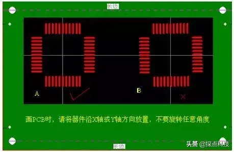 9、放置器件不要旋转任意角度: 由于贴片机无法旋转任意角度,只能旋转90℃、180℃、270℃、360℃。如下图B 旋转了1℃,贴片机贴装后器件管脚与电路板上的焊盘就会错开1℃的角度,从而影响焊接质量。