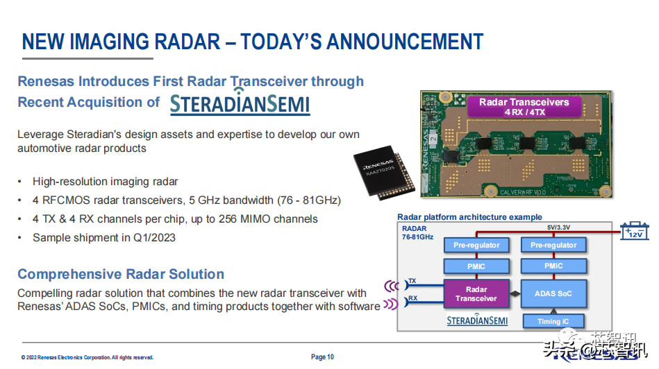 值得一提的是,为了进一步丰富在面向自动驾驶/高级辅助驾驶领域所需的传感器产品组合,今年10月,瑞萨电子完成了对于4D成像雷达解决方案的无晶圆半导体公司Steradian Semiconductors Private Limited(“Steradian”)的收购。