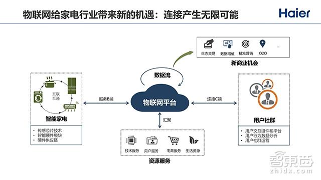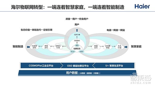 我们很清楚,海尔以前在制造方面是很有优势的。另外,在家电方面,海尔提出了网器的概念。首先电器要变成网器,网器智能化之后,下一步就是变成智慧家庭。所以,对于海尔的物联网转型,我们称为一端连着智慧家庭,一端连着智能制造。对外,我们给用户提供整个智慧体验;对内,我们把用户行为数据反馈到整个生产制造内部,进行实时迭代;中间则是用户,我们希望从顾客到用户,再到以用户为中心,能够让用户在这个生态和平台里面持续交互和迭代。这样就能产生数据,而数据就能够支撑商业模式。