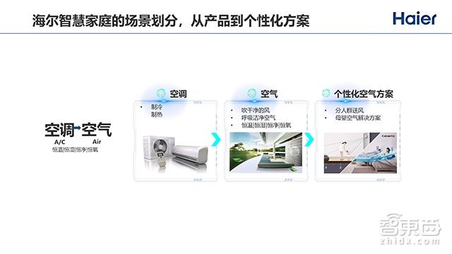 刚才提到海尔智慧家庭是从产品到服务再到场景。比如拿空气、空调来看,之前海尔提供的更多是一个空调产品,但是其实用户要的是空气解决方案,另外不同客户可能有个性化的需求。因此针对整个全屋空气,从之前的空调制冷机到空气解决方案,我们提出了“恒温、恒湿、恒净、恒氧”的解决方案。同时,再往后延伸可以针对不同人群,比如母婴,我们可以提供母婴空气解决方案,这是从产品到个性化方案的变化;另外在空气解决方案里面,从以前被动的控制,到结合大数据,可以对用户的喜好进行个性化的推荐。