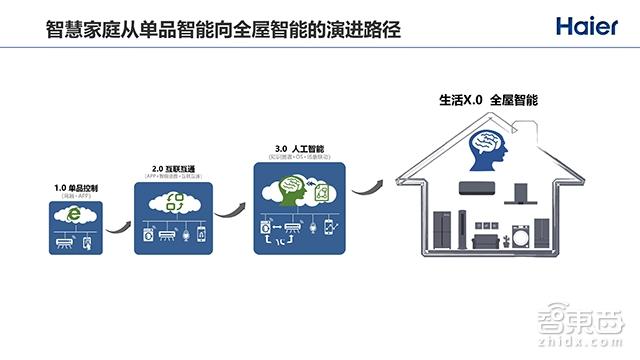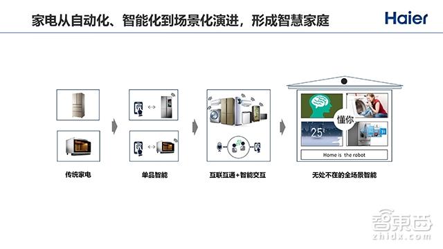 很多人都在问,海尔做智慧家庭跟小米以及其他公司的区别是什么?我们的起点不一样,因为海尔是以家电起家的,做智慧家庭是个目标。所以从家电到智慧家庭,我们经过的路径跟别人可能不一样。我们认为,在家电到智慧家庭的演进过程中,要经过这么几步: