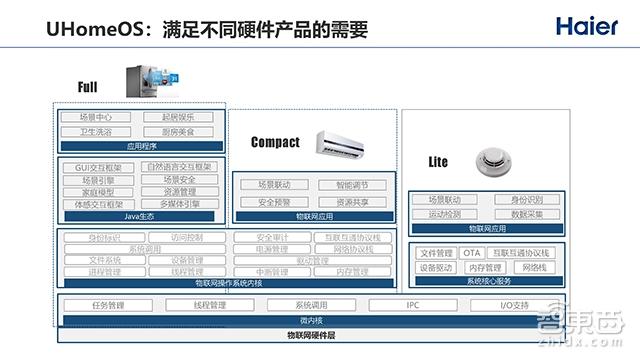 上面讲的大家可能觉得有点抽象,在具体落实到版本时,我们把UHomeOS分为三个版本。三个版本之间能够形成互联互通以及协调联动,分别为Full版本、Compact版本、Lite版本。在物联网时代,最大的不同在于硬件的碎片化,硬件的更新迭代不可能像移动互联网、手机那么快。比如家电,一款硬件有可能就是工作6到8年。另外对硬件成本也会有一些要求。因此,针对UHomeOS,它的底层就是微内核,也是公共的。