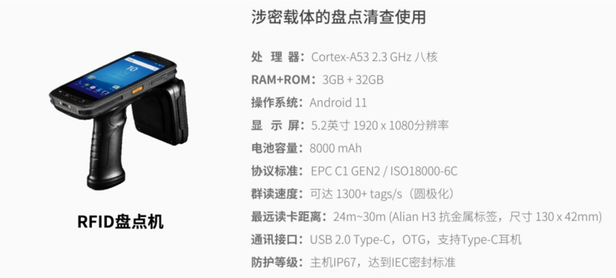 涉密载体使用的RFID手持盘点机是一种专为管理涉密信息和资产而设计的高科技设备,它结合了RFID(无线射频识别)技术与便携式计算机功能,能够高效、安全地执行对涉密载体的清查盘点任务。