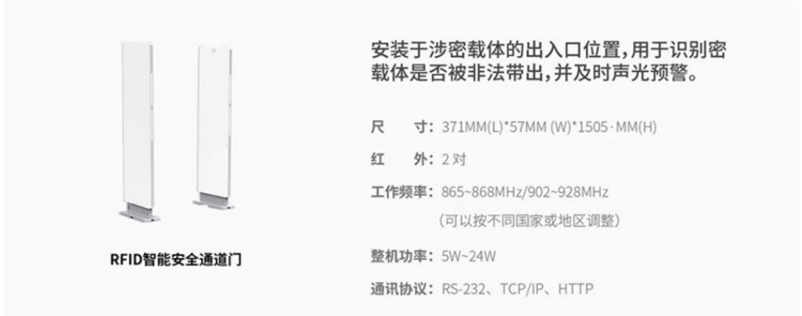 RFID 通道门禁是以RFID技术为核心,并针对仓储、资产、物流等行业应用形成的行业专有化产品。该产品集成RFID、红外感应装置、声光报警等,从而形成了一体化的集成应用设备,并可实现对出入资产信息自动化采集,出入的判定、非法出入载体声光报警等功能。