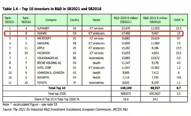 华为5G技术全球第一,标准必要专利数占世界约27%,这些都是华为2012实验室的功劳。值得注意的是,根据华为官网数据显示,近五年来,华为的研发投入总体处于增长状态,2021年华为研发投入1259.1亿元,超过苹果公司,排名第二。这其中,华为2021实验室功不可没。