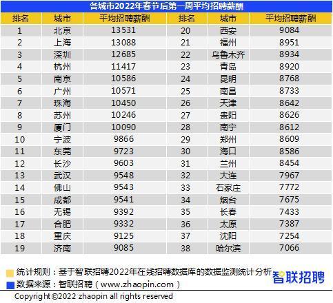 根据报告,节后第一周,企业招聘的平均薪酬为10088元/月,较去年同期8993元/月有明显上涨。北京以13531元/月的薪酬排行全国第一,上海排第二名,平均招聘薪酬为13088元/月。其中郑州平均招聘薪酬8609元/月,排名第29。