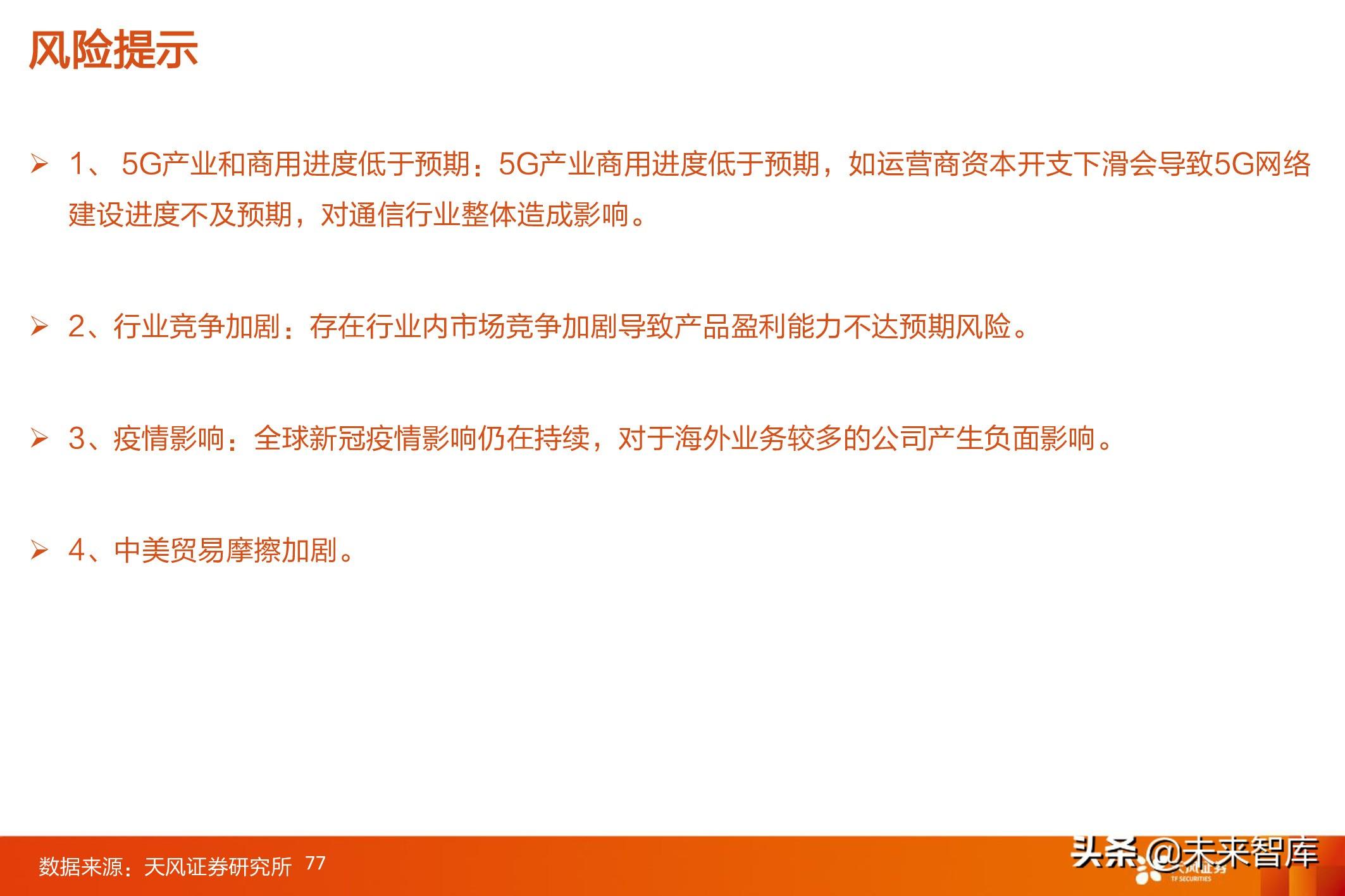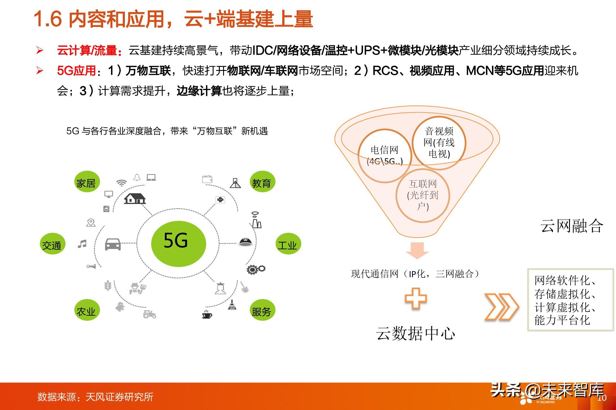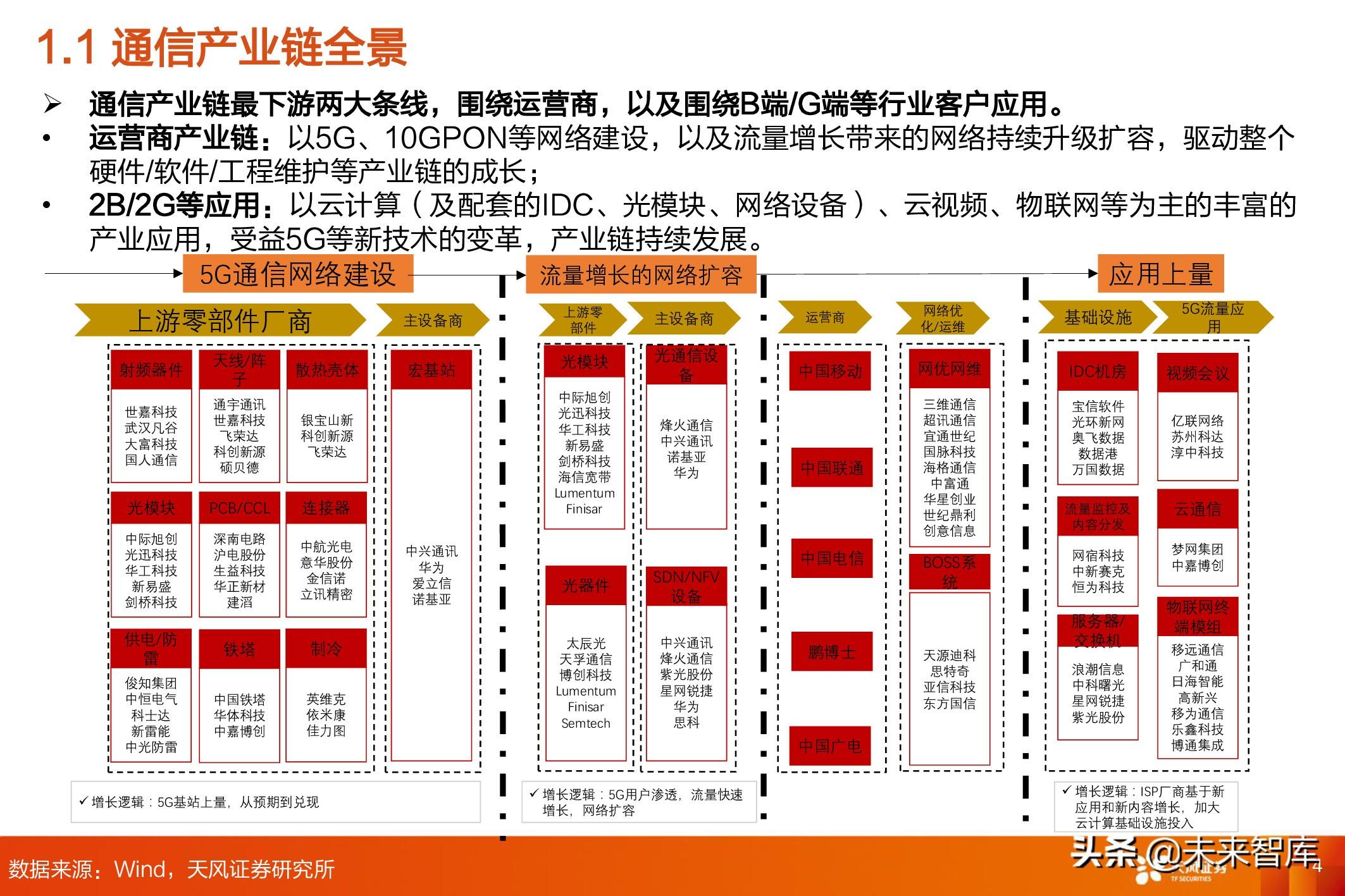 运营商产业链: 以5G、10GPON等网络建设,以及流量增长带来的网络持续升级扩容,驱动整个 硬件/软件/工程维护等产业链的成长;