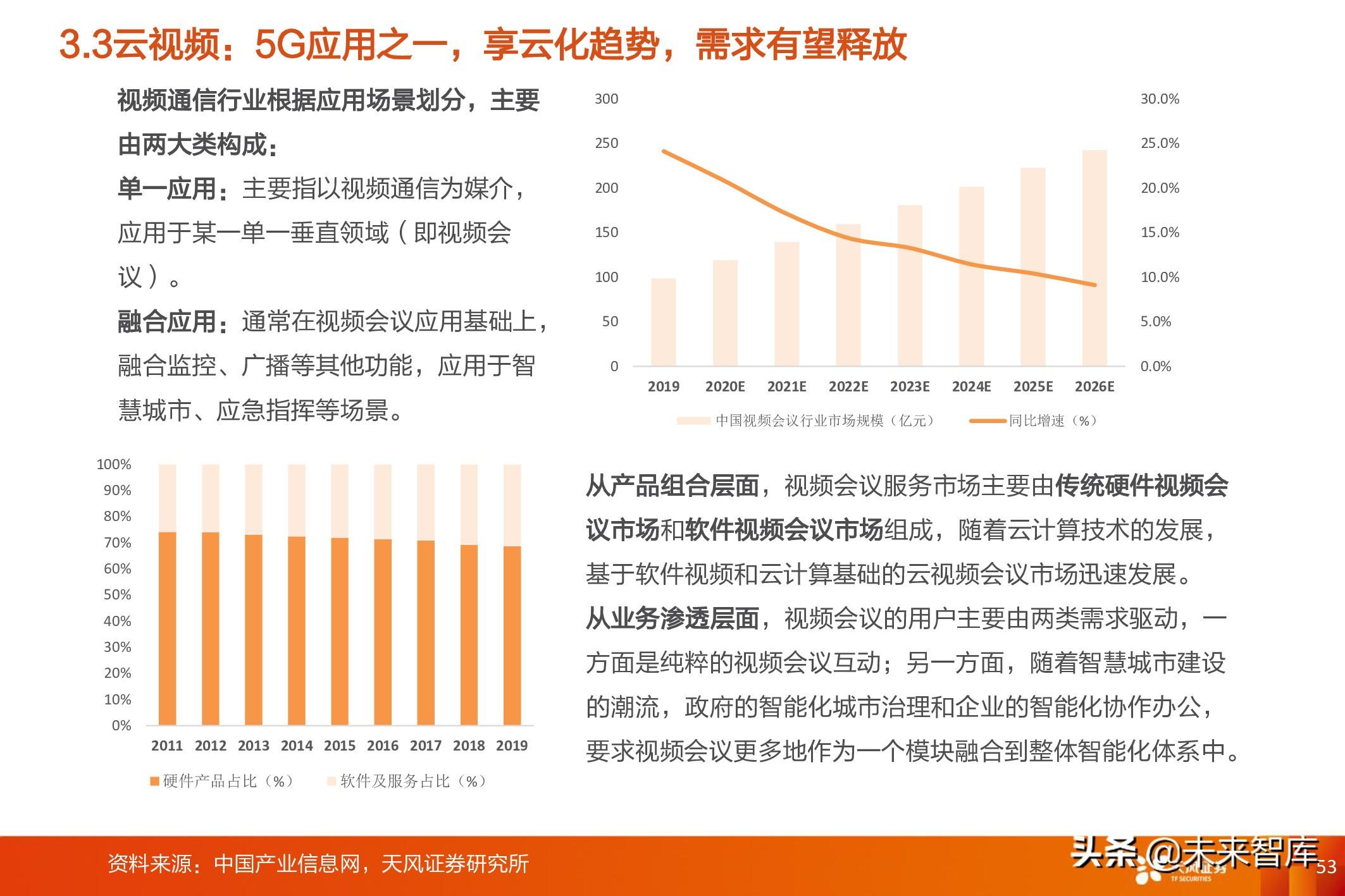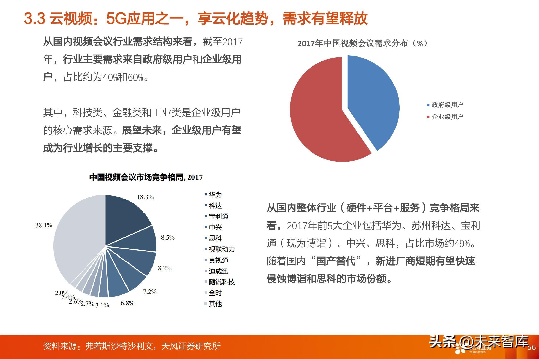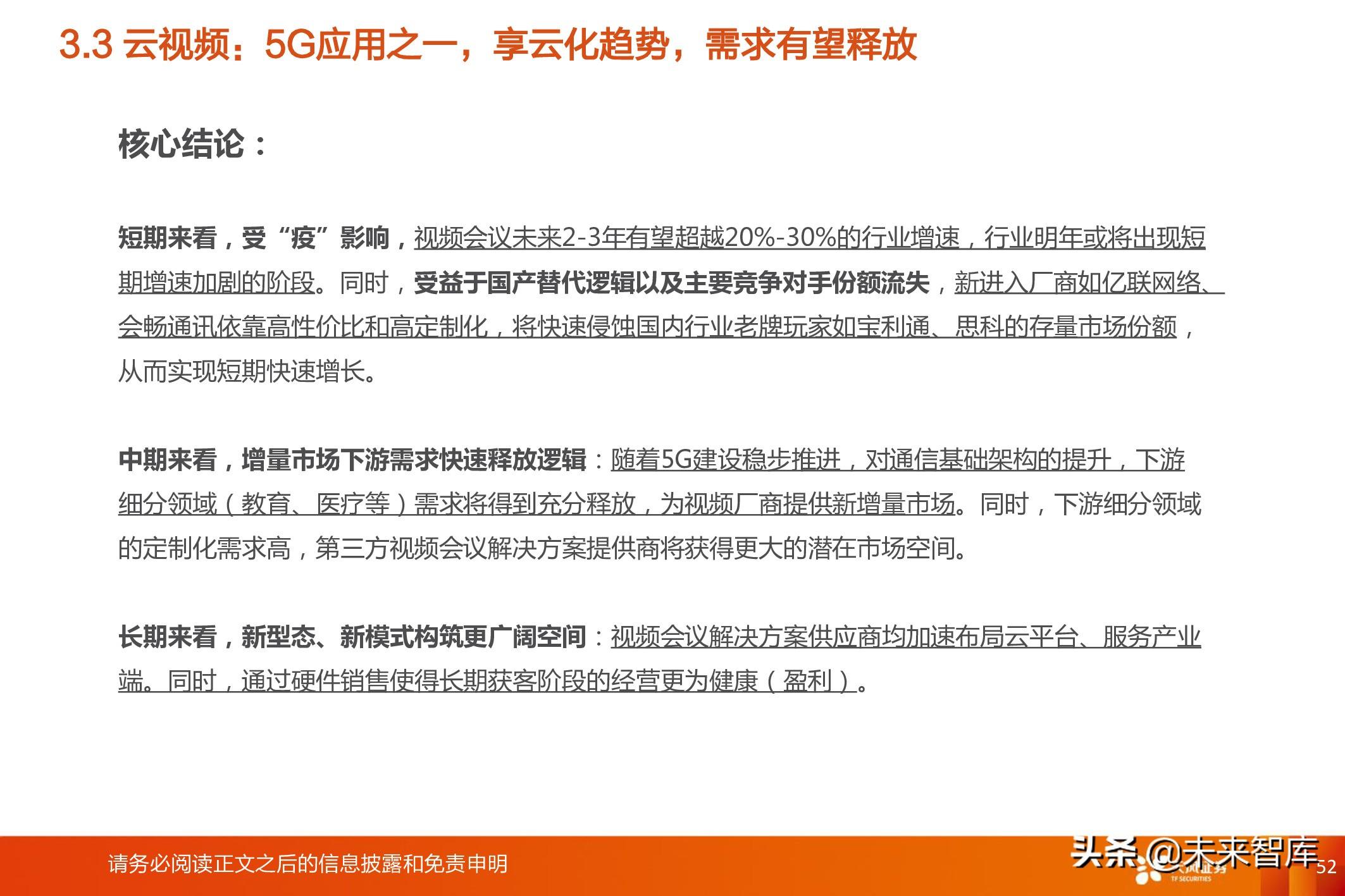 中期来看,增量市场下游需求快速释放逻辑: 随着5G建设稳步推进,对通信基础架构的提升,下游 细分领域(教育、医疗等)需求将得到充分释放,为视频厂商提供新增量市场。同时,下游细分领域 的定制化需求高,第三方视频会议解决方案提供商将获得更大的潜在市场空间。