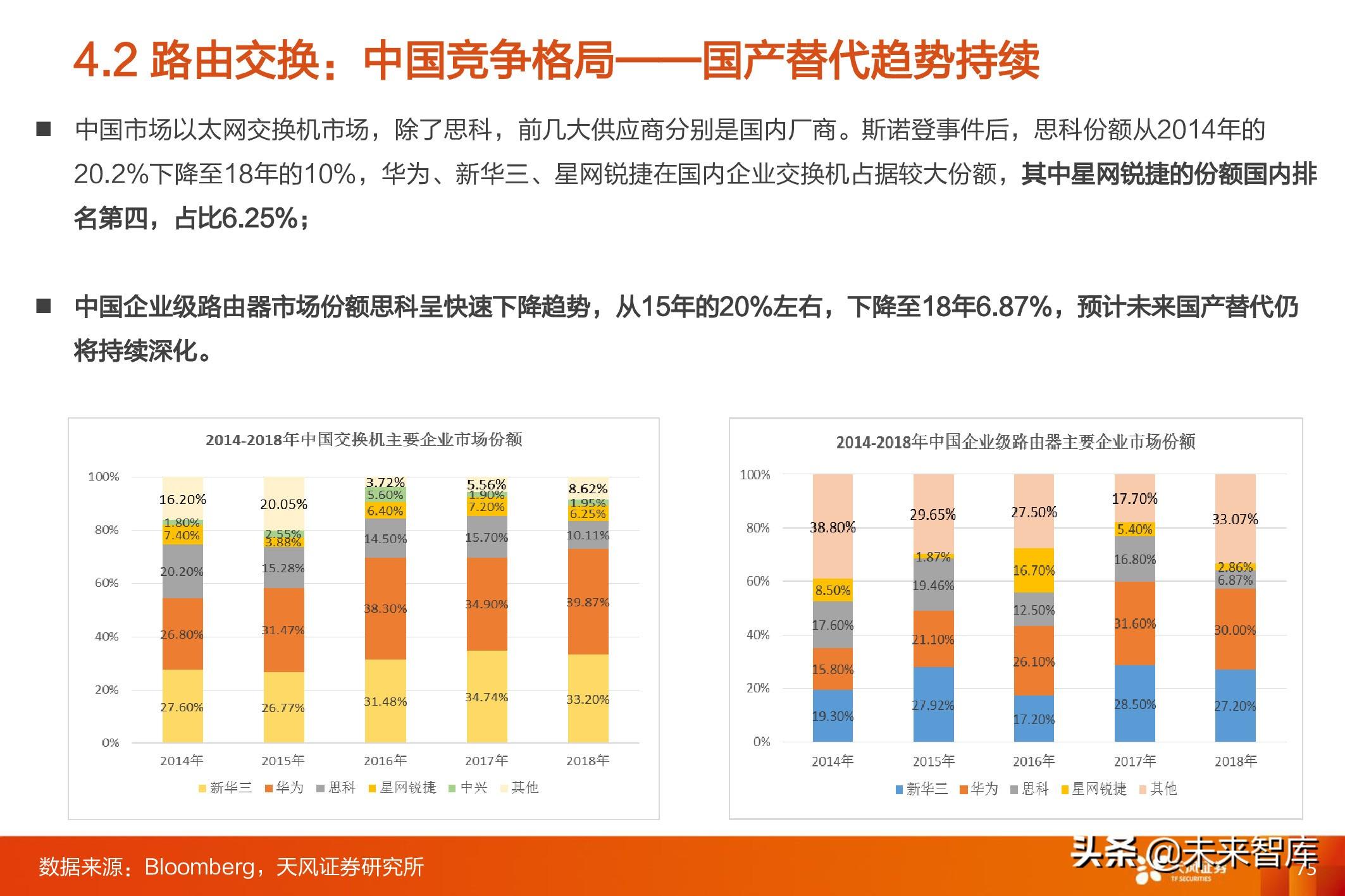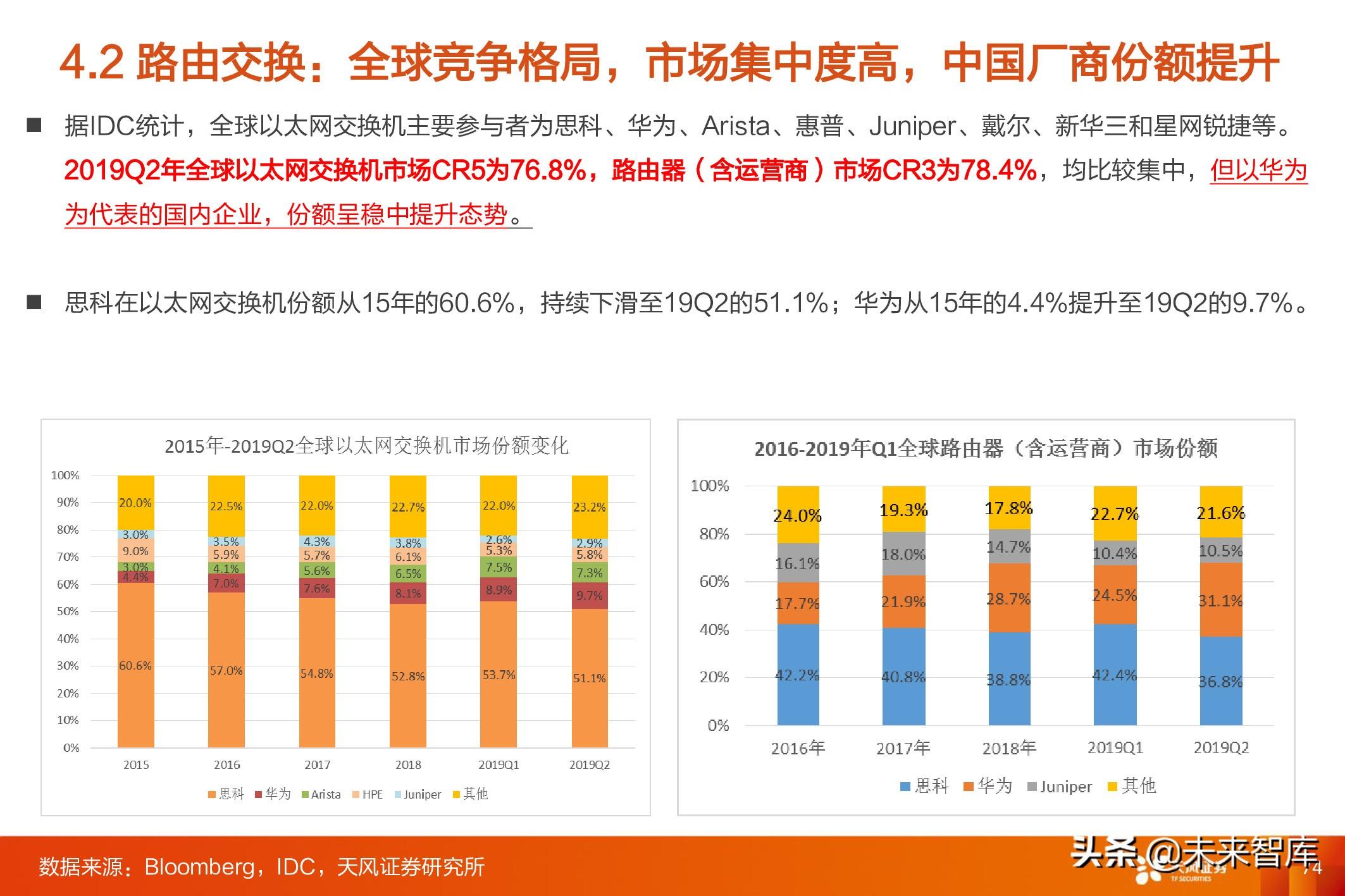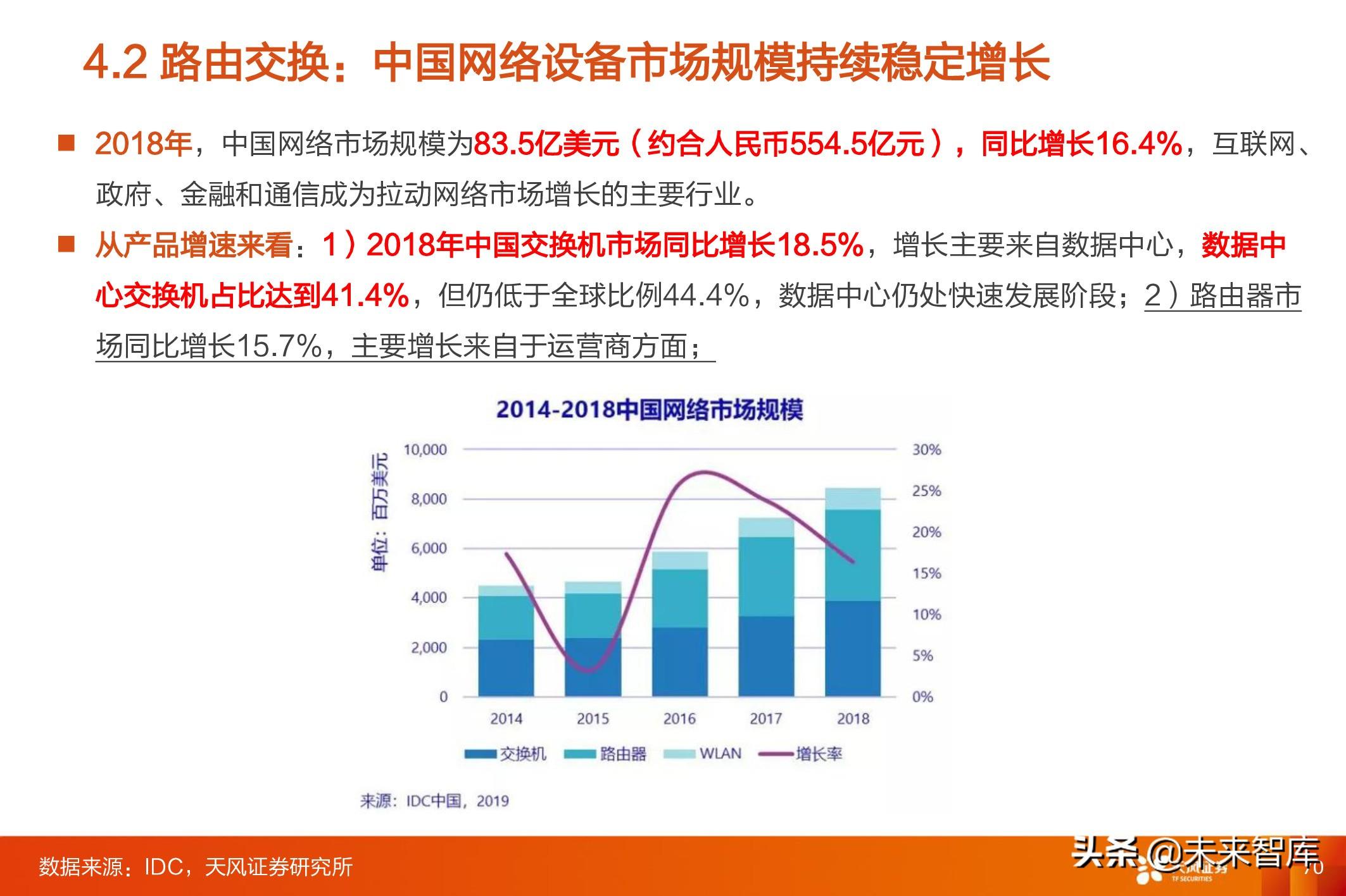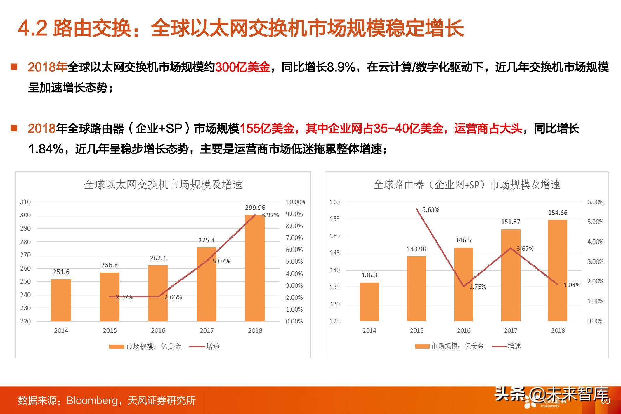 2018年全球以太网交换机市场规模约300亿美金,同比增长8.9%,在云计算/数字化驱动下,近几年交换机市场规模 呈加速增长态势; 2018年全球路由器(企业+SP)市场规模155亿美金,其中企业网占35-40亿美金,运营商占大头,同比增长 1.84%,近几年呈稳步增长态势,主要是运营商市场低迷拖累整体增速;