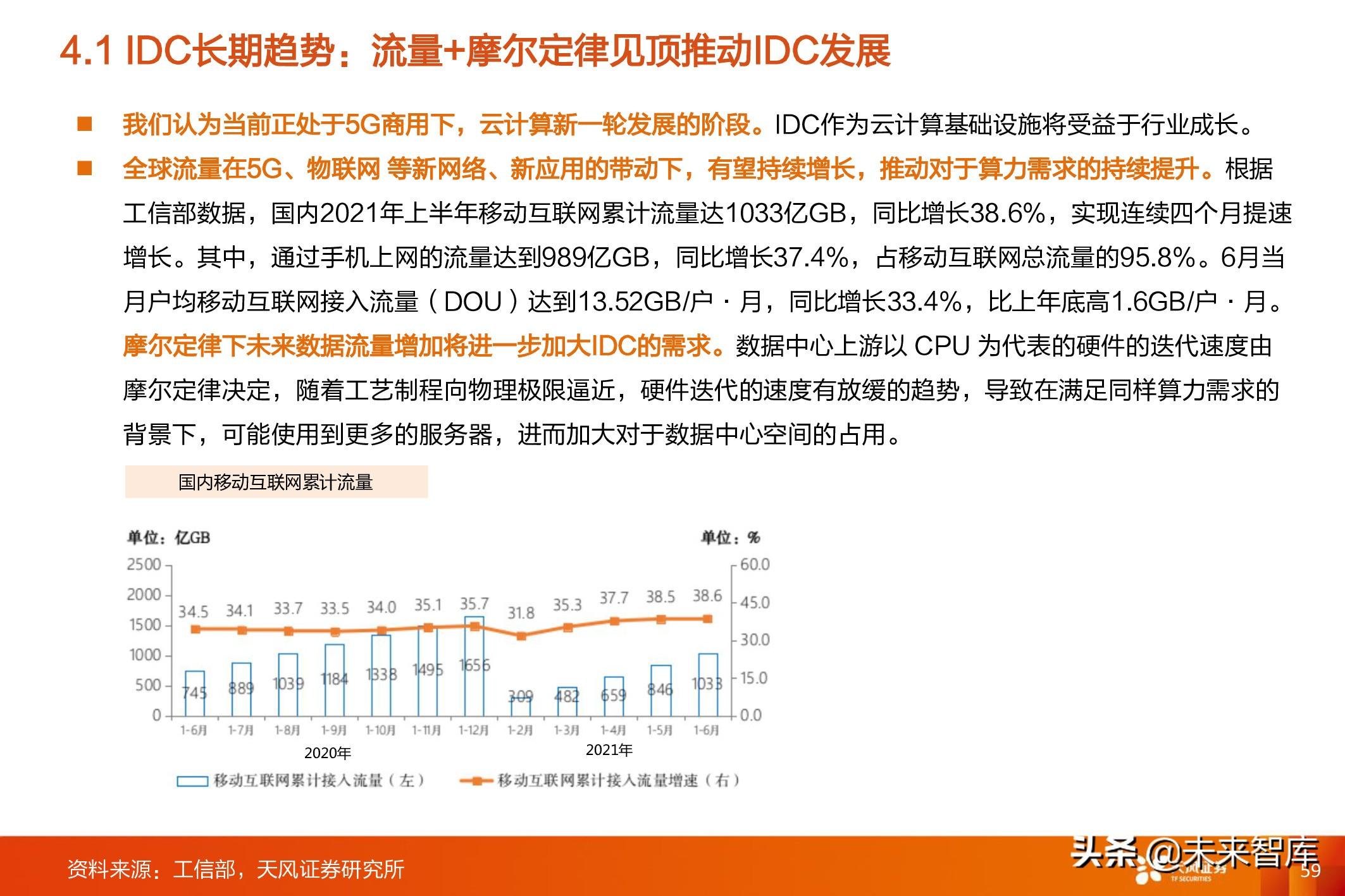 全球流量在5G、物联网 等新网络、新应用的带动下,有望持续增长,推动对于算力需求的持续提升。 根据 工信部数据,国内2021年上半年移动互联网累计流量达1033亿GB,同比增长38.6%,实现连续四个月提速 增长。其中,通过手机上网的流量达到989亿GB,同比增长37.4%,占移动互联网总流量的95.8%。6月当 月户均移动互联网接入流量(DOU)达到13.52GB/户·月,同比增长33.4%,比上年底高1.6GB/户·月。