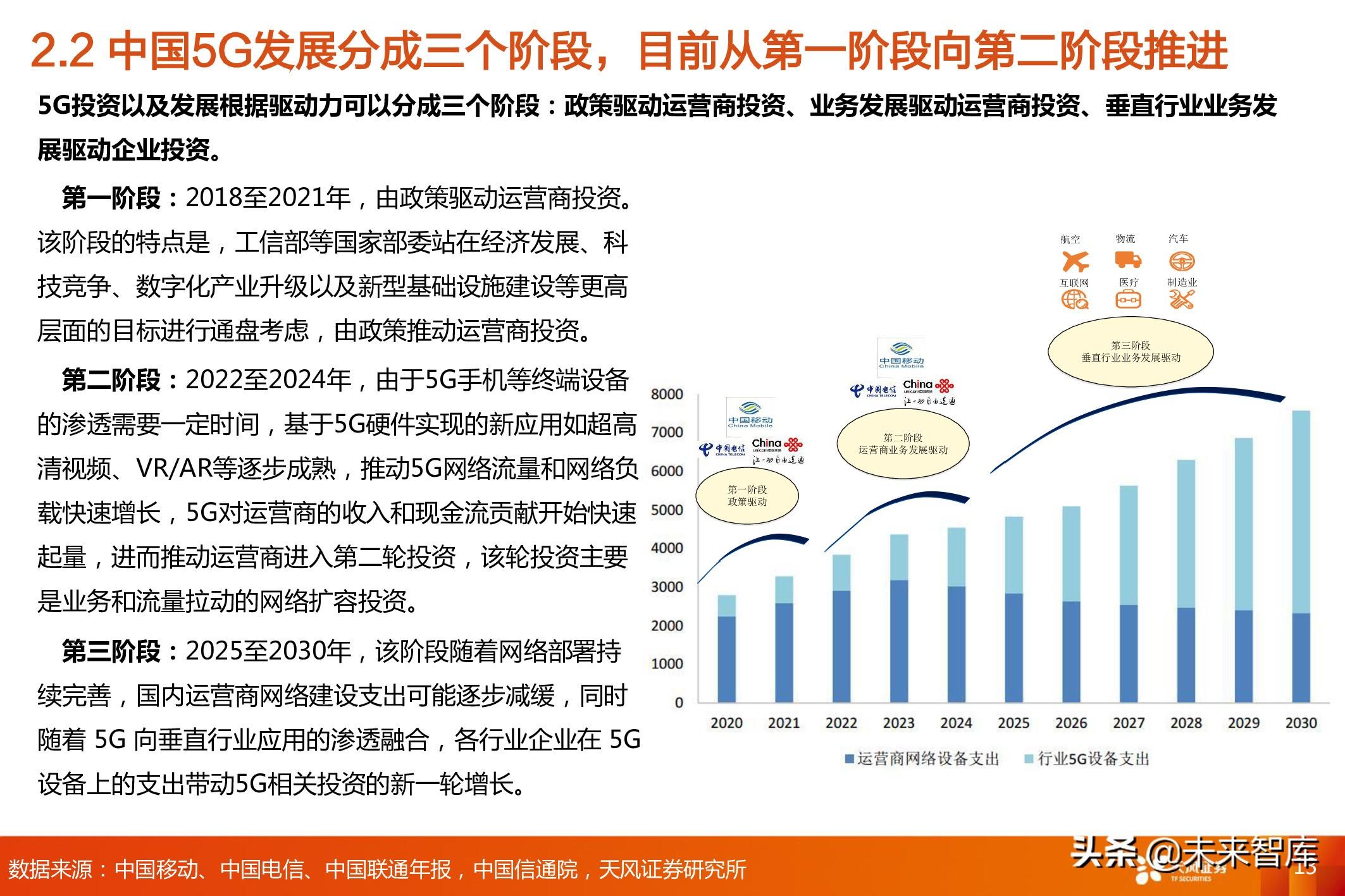 第三阶段: 2025至2030年,该阶段随着网络部署持 续完善,国内运营商网络建设支出可能逐步减缓,同时 随着 5G 向垂直行业应用的渗透融合,各行业企业在 5G 设备上的支出带动5G相关投资的新一轮增长。