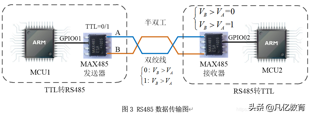 RS-485通信为半双工通信,意思是MCU1和MCU2可以互相发送和接受数据 ,但有一点应注意,由于RS-485只有一对差分信号线A/B故对于MCU1来说发送和接受数据不能同时进行。故在MCU1要顺利实现发送和接受数据则需要在软件层面上指定通信协议。