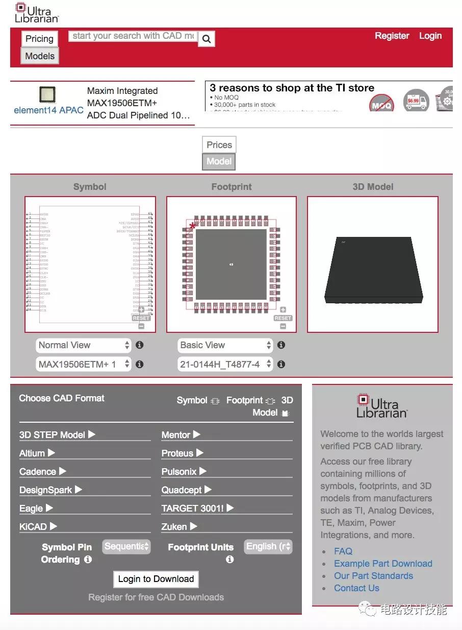 你也可以直接到其官网上进行查询,比如查询一款美信的双通道ADC器件MAX19506,可以看到该网站能够给出原理图符号、封装、3D模型下载,上面是预览,下面是输出支持的CAD格式,在该查询页面内还有相关的数据手册等技术信息以及导e络盟购买的链接。