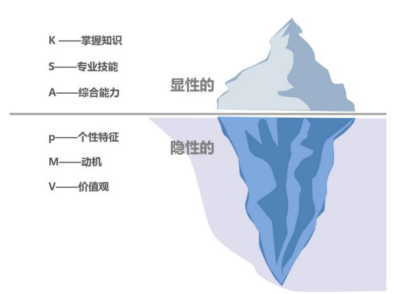 我们在招聘过程中,找来的人经常不被业务部门认可,那是因为我们仅仅关注到了冰山上层的显性的知识技能等信息,而缺少对人才潜质和动机等的描述和判断。如当我们在招“房地产楼盘销售”时,我们将要讨论他需具备的知识技能,能力和内在的性格特质等。