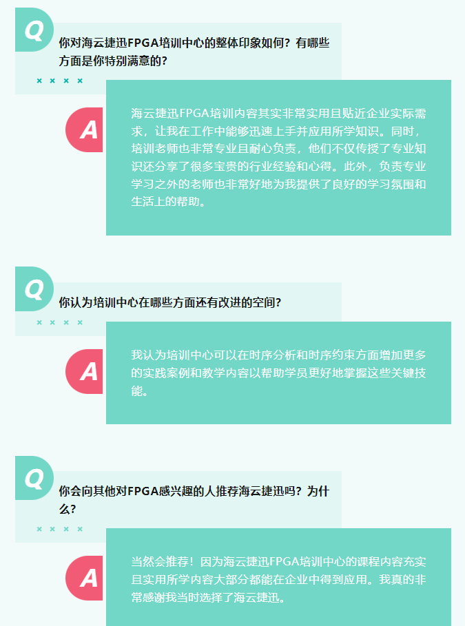 Q 你对海云捷迅FPGA培训中心的整体印象如何?有哪些方面是你特别满意的?