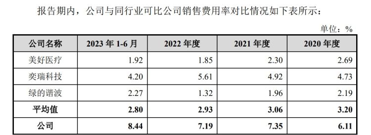 销售费用方面,报告期内,公司销售费用分别为848.49万元、1326.50万元、1916.51万元和1129.42万元,占营业收入比例分别为6.11%、7.35%、7.19%和8.44%。