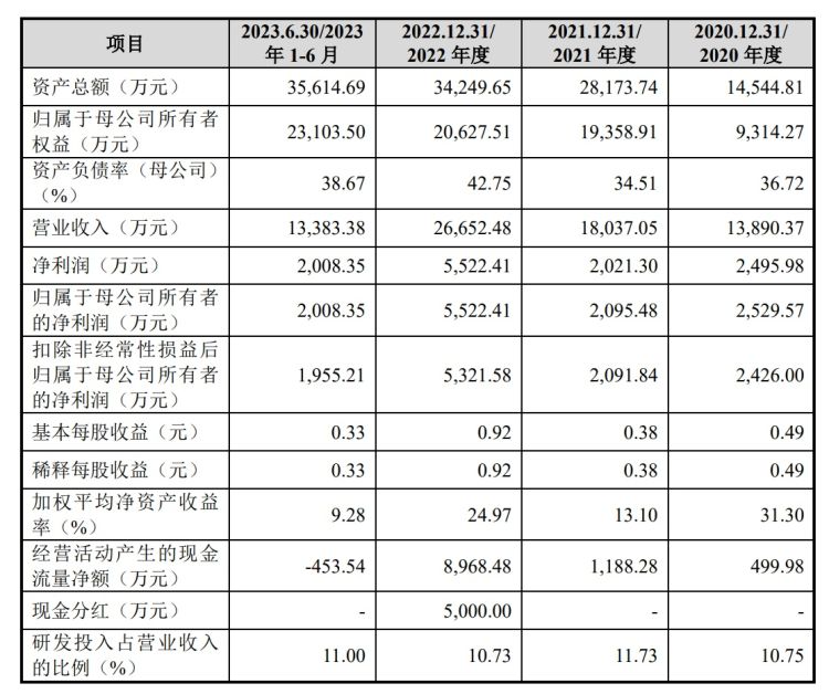 报告期内(2020年-2022年、2023年上半年),公司营业收入分别为13,890.37万元、18,037.05万元、26,652.48万元、13,383.38万元,营收总体呈快速增长趋势 ;归属于母公司股东净利润(扣除非经常性损益前后孰低)分别为2,426.00万元、2,091.84万元、5,321.58万元、1955.21万元,2021年净利润有所下降。