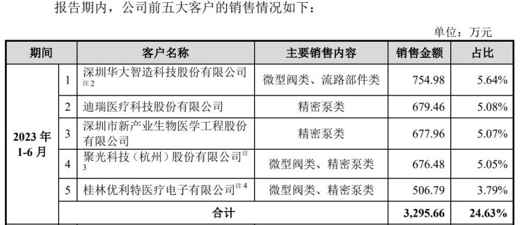 据招股书披露,垦拓流体来自医疗器械和生命科学仪器领域客户的销售收入占比超过50%,其主要客户包括华大智造、迪瑞医疗、新产业、迈克生物、普门科技、迈瑞医疗、聚光科技、力合科技、Leica、Beckman、Transasia、Erba等 多家知名仪器设备制造商。其中,深圳华大智造科技股份有限公司为其第一大客户,2023年上半年销售金额占比为5.64%。