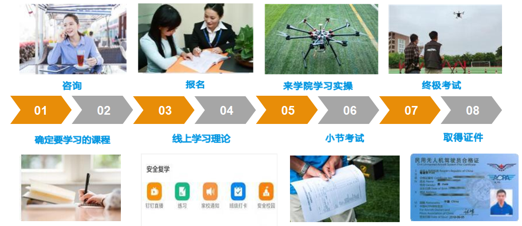 1. 模拟飞行2. 无人机拆装、维护、维修和保养3. 地面站设置与飞行前准备4. 起飞与降落训练5. 本场带飞6. 本场单飞7. 紧急情况下的操纵和指挥8 .考核与结业