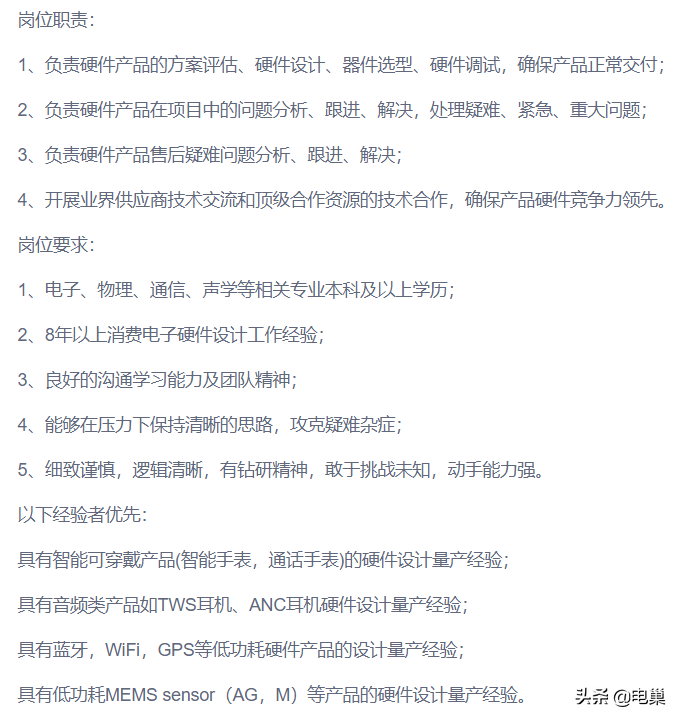 8年以上经验会限制很多人,华米是做手环的,有低功耗、蓝牙和WiFi这些工作经验的,是有优势的。