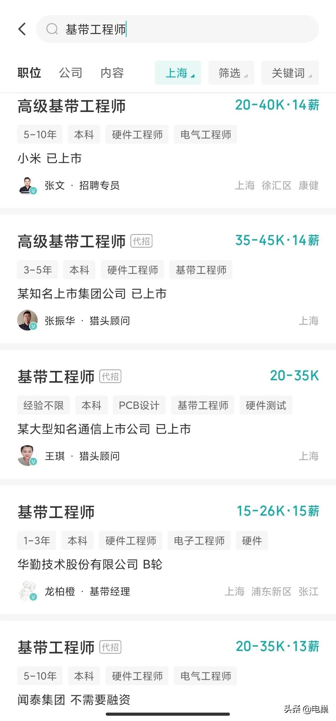 我去BOSS直聘上搜了一下,我现在从事的硬件-基带工程师的工资。