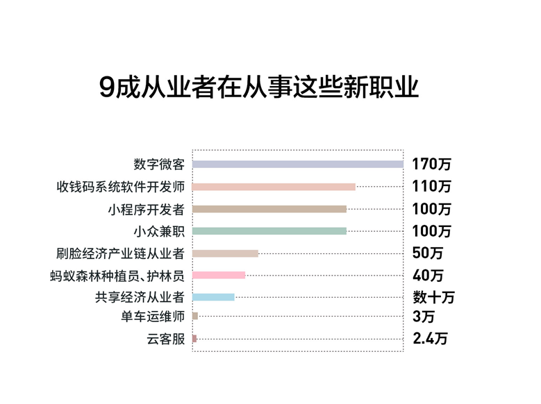 其三,新职业不乏高收入者。比如推广收钱码的数字微客,这个人群既有个人兼职,又有创业团队,其中99%都是50人以下的小微企业,做得最好的单月收入可达数百万元。