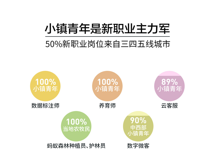 其次,新职业从业者中,约一半生活在三四五线市县。如支付宝云客服,2-5线城市人数占比88.5%,数据标注师几乎全是小镇青年。