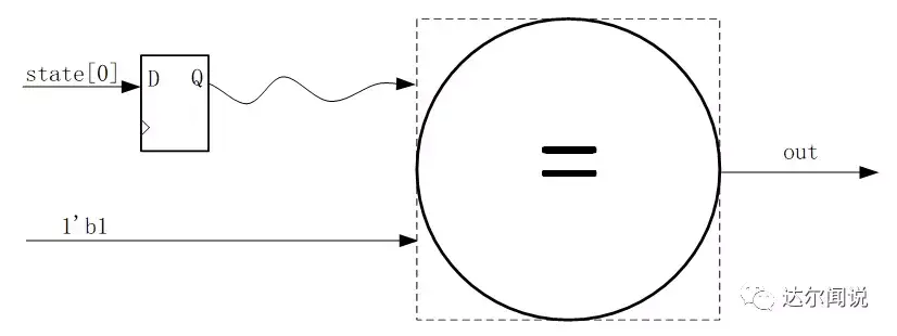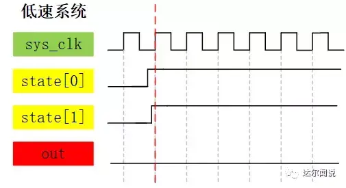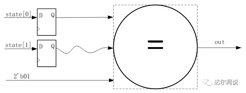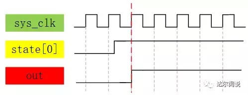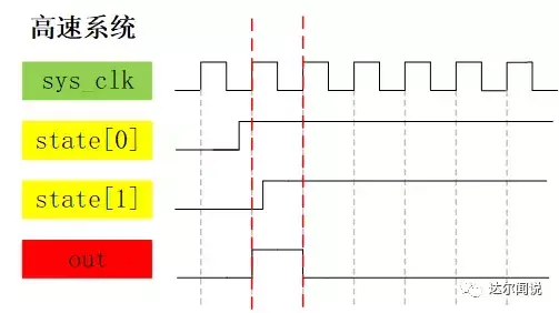 讲到这里并没有结束,我们稍微拓展一下让大家学到更多。为什么例子中我们使用的是独热码而非二进制码或格雷码呢?那就要从每种编码的特性上说起了,首先独热码因为每个状态只有1bit是不同的,所以在执行到43行时的(state == TWO)这条语句时,综合器会识别出这是一个比较器,而因为只有1比特为1,所以综合器会进行智能优化为(state[2] == 1’b1),这就相当于把之前3比特的比较器变为了1比特的比较器,大大节省了组合逻辑资源,但是付出的代价就是状态变量的位宽需要的比较多,而我们FPGA中组合逻辑资源相对较少,所以比较宝贵,而寄存器资源较多,所以很完美。而二进制编码的情况和独热码刚好相反,他因为使用了较少的状态变量,使之在减少了寄存器状态的同时无法进行比较器部分的优化,所以使用的寄存器资源较少,而使用的组合逻辑资源较多,我们还知道CPLD就是一个组合逻辑资源多而寄存器逻辑资源少的器件,因为这里我们使用的是FPGA器件,所以使用独热码进行编码。就因为这个比较部分的优化,还使得使用独热码编码的状态机可以在高速系统上运行,其原因是多比特的比较器每个比特到达比较器的时间可能会因为布局布线的走线长短而导致路径延时的不同,这样在高速系统下,就会导致采集到不稳定的状态,导致比较后的结果产生一个时钟的毛刺,使输出不稳定,而单比特的比较器就不用考虑这种问题。下面是示意图解析: