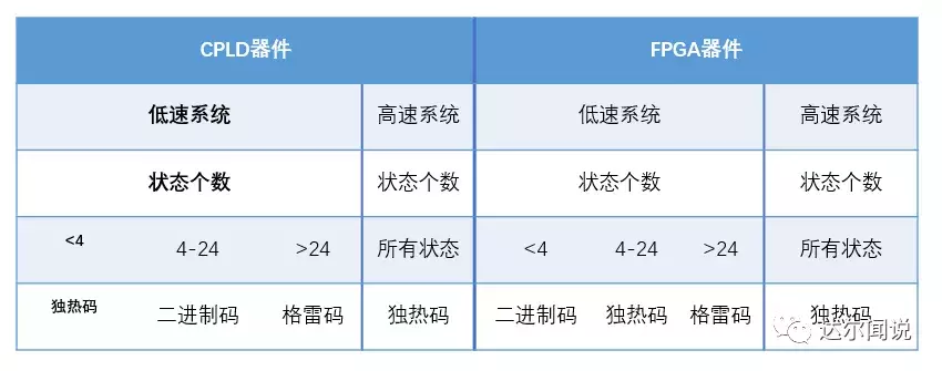 最后我们用一个表格来总结一下什么时候使用什么方式的编码效果最好(有时候不管你使用哪种编码方式,综合器会根据实际情况在综合时智能的给你进行编码的转换,当然这需要你设置额外的综合约束,这里我们不再详细讲解) 。