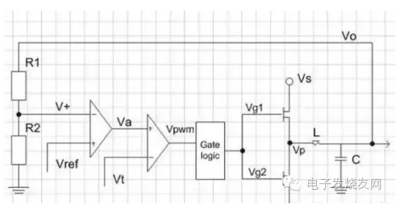 如上图,为了从高电压Vs得到Vo,开关电源采用了用一定占空比的方波Vg1,Vg2推动上下MOS管,Vg1和Vg2是反相的,Vg1为高,Vg2为低;上MOS管打开时,下MOS管关闭;下MOS管打开时,上MOS管关闭。由此在L左端形成了一定占空比的方波电压,电感L和电容C我们可以看作是低通滤波器,因此方波电压经过滤波后就得到了滤波后的稳定电压Vo。Vo经过R1、R2分压后送入第一个放大器(误差放大器)的负端V+,误差放大器的输出Va做为第二个放大器(PWM放大器)的正端,PWM放大器的输出Vpwm是一个有一定占空比的方波,经过门逻辑电路处理得到两个反相的方波Vg1、Vg2来控制MOSFET的开关。