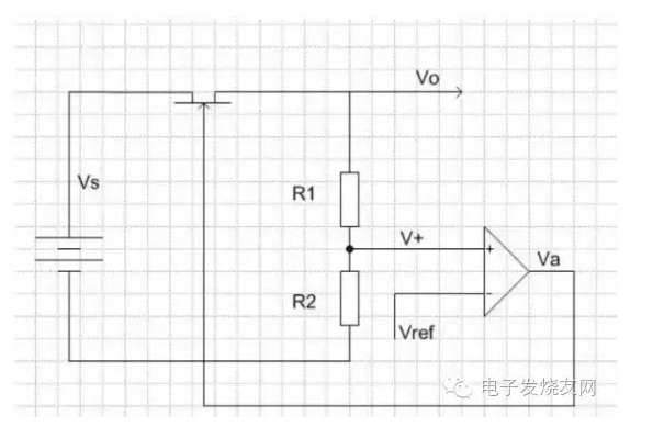 现在我们来看Vo是怎么稳定的,假设Vo变小,那么V+将变小,放大器的输出Va也将变小,这将导致MOSFET的阻抗变小,这样经过同样的电流,MOSFET的压差将变小,于是将Vo上抬来抑制Vo的变小。同理,Vo变大,V+变大,Va变大,MOSFET的阻抗变大,经过同样的电流,MOSFET的压差变大,于是抑制Vo变大。